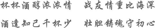 公司创始人周城文出身军人世家,为祖国边防安全稳定做了自己贡献,公司的战友情酒业也是为了致敬一起战斗的战友和一起打拼的同事。也希望用战友情酒可以联系到多年失联的老战友,更好的共叙军旅情。